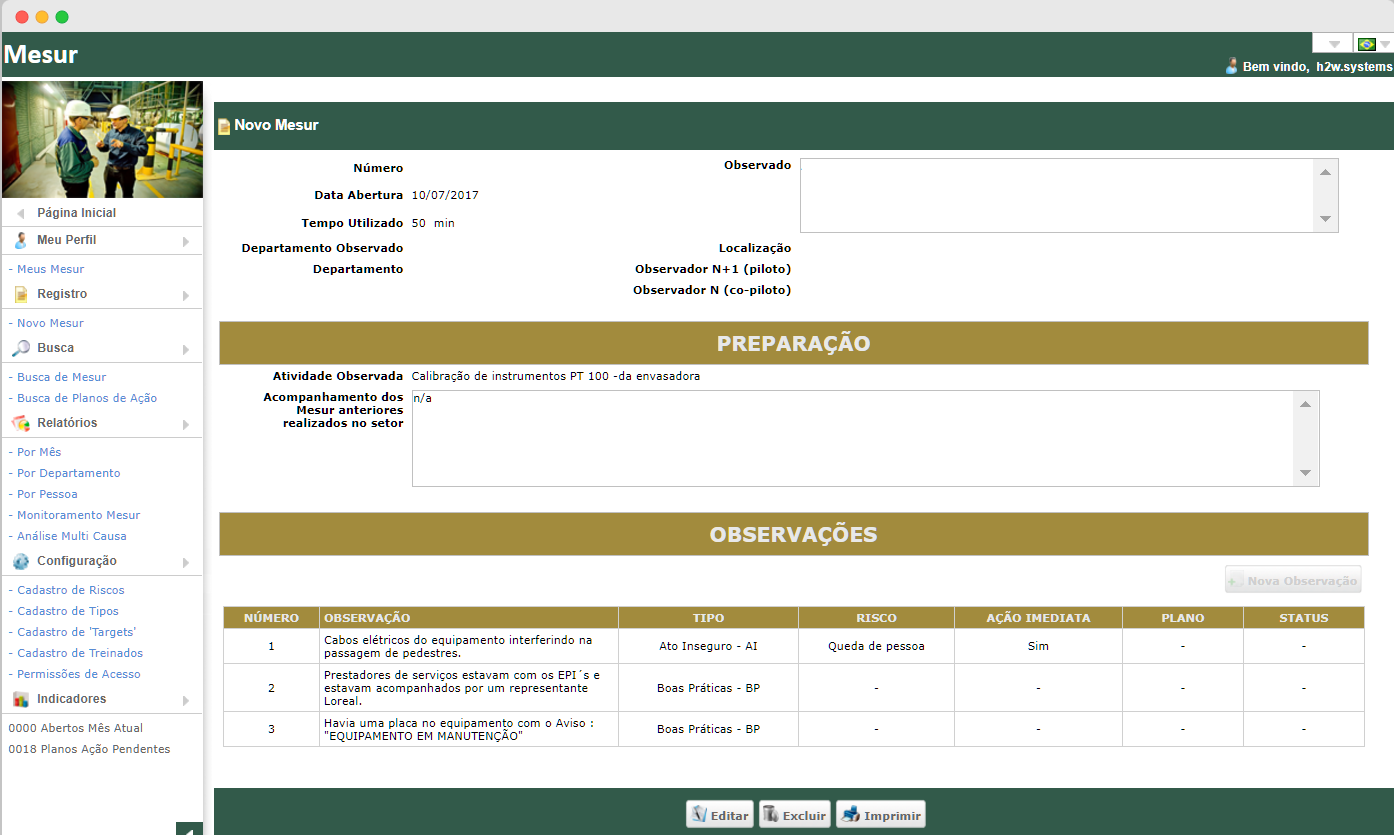 This tool allows the management of work safety observations as unsafe acts and conditions. Observations are performed directly by users in the system, allowing real-time analysis.