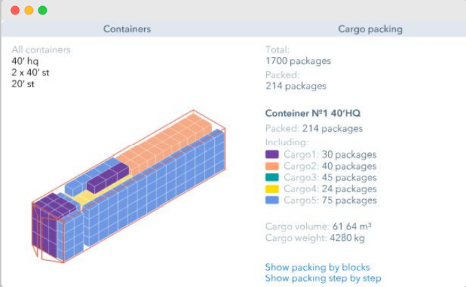 Software that optimizes the use of pallets, trucks and containers through an algorithm that considers product dimensions, available means of transport, load weight, freight costs and restrictions for each customer.