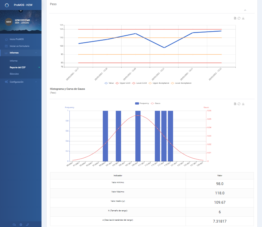 Genere informes estadísticos con CP y CPK, gráficos, curva de Gauss e Histograma.